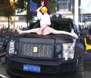 一字马美女(湖南:气质美女大秀身材,爬上车头摆一字马拍照,引来路人围观)