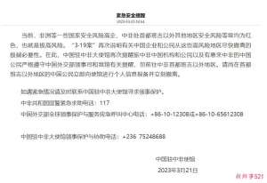 3月23日电 据中国驻中非大使馆网站消息,23日,中国驻中非使馆发布紧急安全提醒:当前,非洲等一些国家安全风险高企,中非处首都班吉以外其他地区安全风...