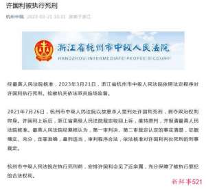 3月21日电 据杭州市中级人民法院微信公众号消息,经最高人民法院核准,2023年3月21日,浙江省杭州市中级人民法院依照法定程序对许国利执行死刑。检察机关依...