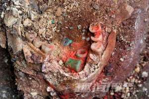1.仔细清理头骨满口的玉制珠宝考古人员在恰帕德科尔索城金字塔古墓墓主嘴里发现了满口的玉制珠宝,这位墓主被认为是颇具势力的中年男性。嘴部的骨头和身...