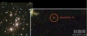 美国宇航局的哈勃太空望远镜拍摄的Abell 2744星系团照片,放大区域为Abell2744_Y1星系及周边地区。Abell2744_Y1是迄今为止发现的最遥远的星系之一,当时的宇宙只有...
