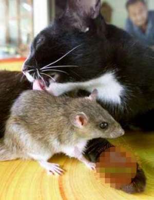 东安县卫生防疫站主管医师王凤仙养的猫产了3只子。除夕这一天,王凤仙医师去喂猫,发现猫窝里有一只约300克重的老鼠与猫爬在一起吃食。王医师觉得很奇怪...