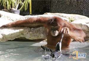 爱心爆棚:红毛猩猩喂小企鹅吃鱼,满满都是爱