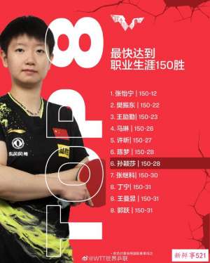 3月16日电 16日,WTT世界乒联官方社交媒体发文祝贺中国选手孙颖莎,“恭喜孙颖莎成为最快达到职业生涯150胜历史第六位。”图片来源:WTT官方微博 胜负计...